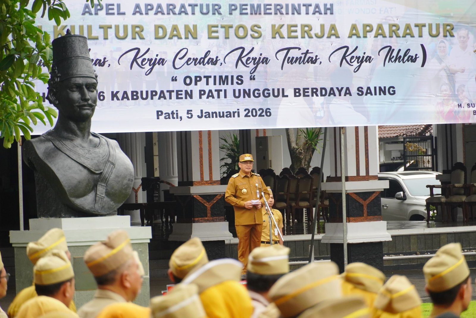“Pada hari ini, 5 Januari 2026, kami mengadakan apel aparatur pemerintah sebagai penegasan bahwa aparatur di lingkungan Pemerintah Kabupaten Pati betul-betul siap bekerja dan siap melayani dengan kerja yang cerdas, keras, tuntas, dan ikhlas,” ujar Sudewo.
